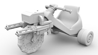My wife and I were messing around with game asset ideas and after about an hour it had evolved into a game of riding around on a big-wheel bike with nerf type guns attached to it. So I went with it. I used those two things as a starting point and made a quick sketch. There will be two identical guns in the front attached to the wheel and one gun mounted on the back. They will shoot discs (Eco friendly of course) that are fed to the guns by large ammo boxes that are easily replaced at refill stations. Also the front guns are detachable by releasing the clips. The guns are shot by triggers that are on the handle bars (works the same as a common bike brake). That is about as far as I got.